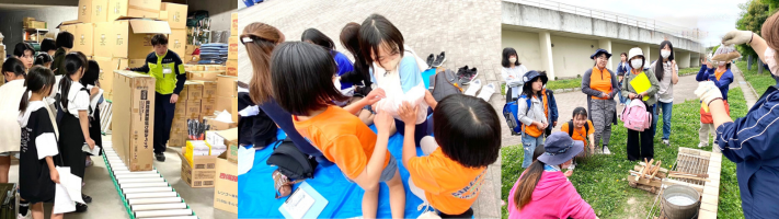 [ベンチかまど体験・マンホールトイレ見学・備蓄倉庫内見学・身近な物での応急手当・新聞紙で食器とスリッパ作り・水を簡単に運ぶ体験・ダンボールベッド体験]