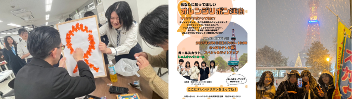 さっぽろテレビ塔をオレンジ色にライトアップしたり、北海道と秋田県合わせて600個以上のPRセットを配付したりしたことで、オレンジリボン運動の認知度を高めることができた。 - オレンジリボンを一緒に作成したり、オレンジリボンをポスターに貼ってもらったりすることで市民の皆さんに関心を寄せてもらい、地域で支えあう社会に近づくことができた。