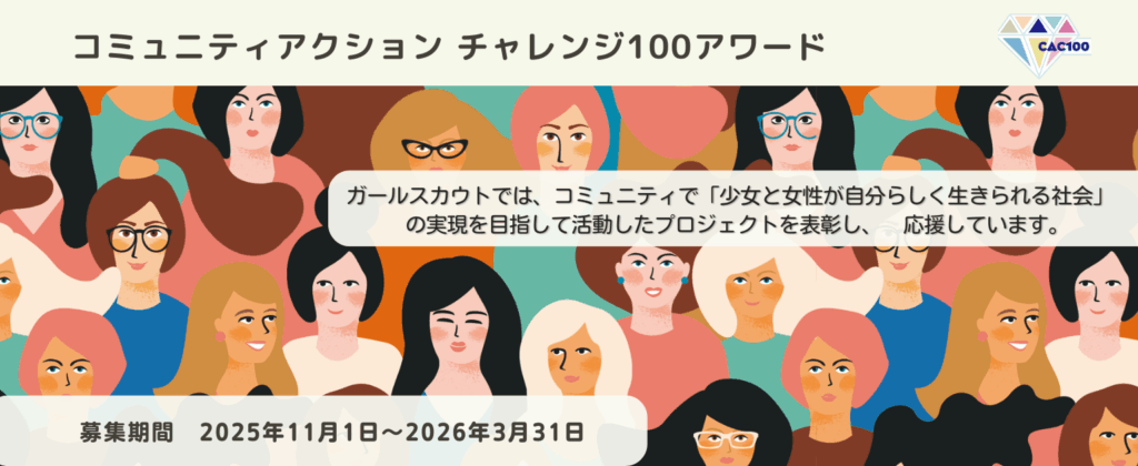 私たちガールスカウトは、日頃の活動を通して世界各国において仲間と一緒に力を発揮し、声をあげ、コミュニティに変化をもたらしています。ガールスカウト日本連盟は、皆さんと一緒によりよい社会を目指したいという思いで、コミュニティアクション チャレンジ100アワード(以下CAC100アワード)を創設しました。